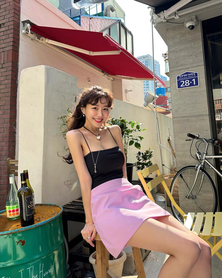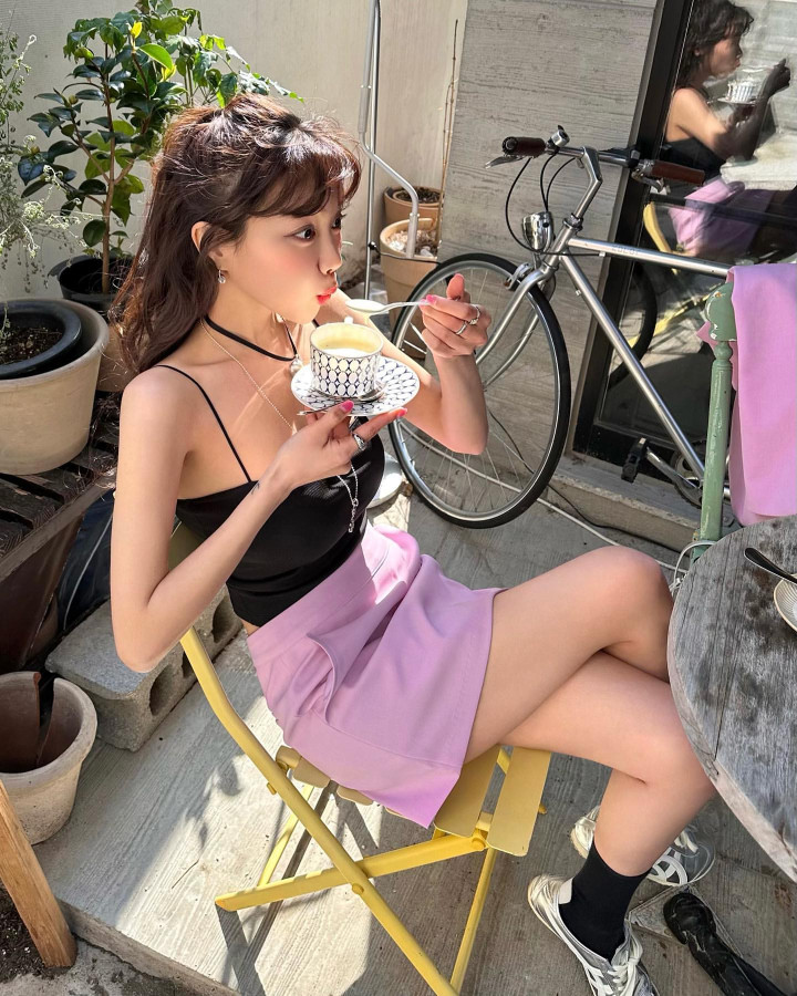 配色上,一定要用“黑色+粉色”的万能对冲公式。黑色作为最强的中性色,既能压住粉色的甜腻感,给甜美的粉色增加几分酷飒的辣妹感,又能形成强烈的视觉对比,让穿搭更有层次,不会因为大面积的粉色显得单调乏味。上半身用黑色吊带打底,下半身用粉色半裙,上下身的配色形成平衡,哪怕是大面积的粉色,也不会显得浮夸,甜酷平衡,永远不会出错。