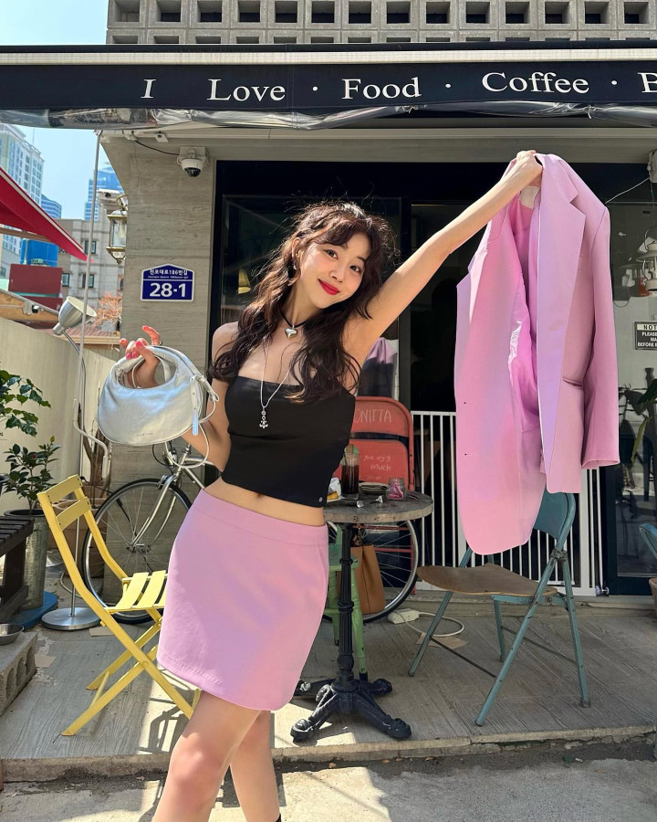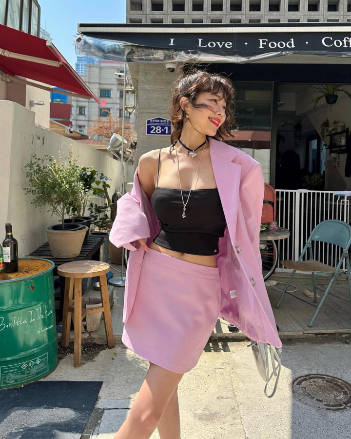 其实想要解锁春日既日常又出片的穿搭,根本不用费心堆砌复杂单品,一套“黑色吊带+粉色西装半裙套装”的组合,就能完美平衡甜与辣、正式与休闲,既能在咖啡店拍出氛围感大片,日常通勤、周末约会也完全不违和。很多人对粉色西装套装有刻板印象,觉得它只适合白皮、只能在正式场合穿,但只要掌握正确的搭配逻辑,哪怕是黄皮、微胖、穿搭新手,也能把这套组合穿出独属于自己的风格,轻松拿捏春日的灵动与性感。