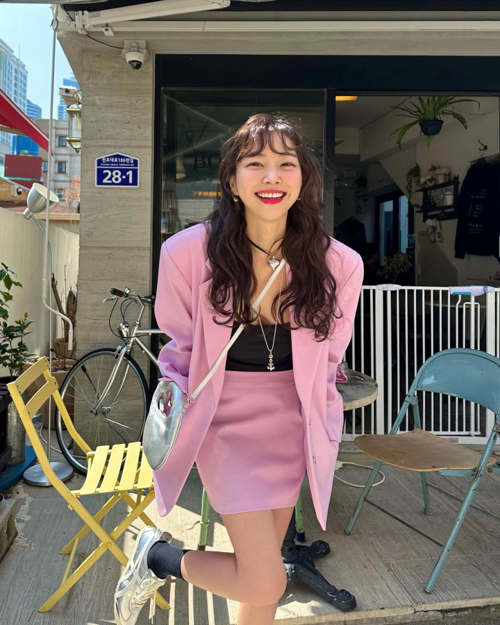而粉色西装外套的加入,更是让这套搭配的适配度直接拉满。宽松的oversize版型,和内搭的修身吊带、短款半裙形成“外松内紧”的对比,既能藏住拜拜肉、腰腹的小赘肉,又能给性感的吊带增加一层得体的保护。日常通勤穿,把西装扣子扣好,就是干练又温柔的职场穿搭;周末约会探店,把西装半披在肩上,就是氛围感满满的韩系女主风,一套搭配就能无缝切换多种场景。